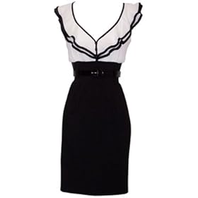 Product DescriptionKnee-length dress, crinkle chiffon ruffle top with satin piping, slimming control stretch black lower half with patent belted waist. Junior size S-5X.
