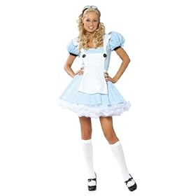 3 Piece Alice Costume includes Mini Dress, Apron with Bow Back and Button Front, and Head Band. (Shown with Knee High Stockings and Puffy Petticoat not included.)