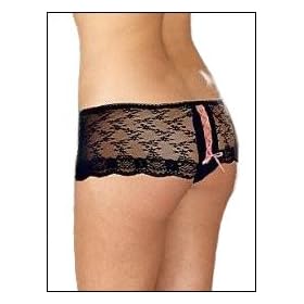 Can you say Ooh la la? These French inspired boy-style "knickers? are just the cutest panties ever. The delicate wide lace yoke rides low on the body and is joined at the back by sexy pink ribbon lacing. The big surprise is the split crotch that offers ultimate freedom and comfort. Order item 20-30030 for regular size