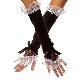 Turn your lingerie into an instant Maid?s ensemble with our totally adorable fingerless gloves. A long slender stretch of fabric slips over your fore arm and ends dramatically over your hands in a show of white and black lace that drapes just above your fingers. The top is finished off with a white lace ruffle. Ooh la la!.