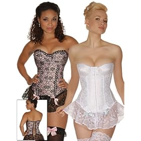 Our strapless French-inspired corset features rose lace over satin and reshapes your entire torso from bustline to below the hips. The underwired cups have removable push-up pads to lift your bosoms up and over. (See size chart below) Boned all around to create an hourglass shape, its bi-directional lace-up back pulls you in to take off up to 2? on your waistline. The invisible hook and eye front closure make on and off so easy. A glamorous 5? soft lace ruffles cascades over your lower hip line and ends at your upper thigh, hiding a multitude of figure flaws and adding to the gorgeous elongated look of this corset. A matching G-string is included. Size Chart 32-fits 32B-C-D 34-fits 34B-C-D 36-fits 36B-C-D 38-fits 38B-C-D-DD.