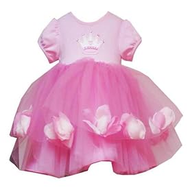 Beautiful PINK tulle dress features puffed short sleeves and round neckline with SPARKLING EMBROIDERED BEADED CROWN APPLIQUE. Pink TIERED TULLE SKIRT features 'floating' PETALS - Comes with panty/bloomer. Bodice of 100% cotton - Skirt of nylon - Underskirt of polyester - Exclusive of trim/decoration- Hand wash, dry flat- Imported. Panty of polyester - Machine washable - Imported.