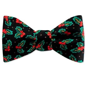 This beautiful silk Christmas freestyle butterfly bowtie was created by Wild Ties. It features a repeating Holly pattern on a black background. A wonderful bowtie for displaying your holiday spirit. Fits up to a 22 inch neck.
