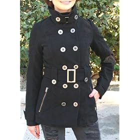 Hip military style jacket by the BB Dakota Jack line! This darling jacket is sure to keep you all snuggled up with its super soft faux wool exterior! Would make a great addition to any fall/ winter wardrobe. Features black faux wool exterior with a double breasted brass button down front, belt with brass buckle, button tab cuffs, two brass front zipper pockets, and mock neck with buckle strap. Made out of 50% Polyester, 7% Rayon, 3% Spandex, and with a 100% Polyester lining. - Hand wash cold Please Note Before Ordering: BB Dakota jackets/coats *only* run in junior sizes. X-Small = Junior Size 0-2 Small = Junior Size 3-5 Medium = Junior Size 6-8 Large = Junior Size 9-12